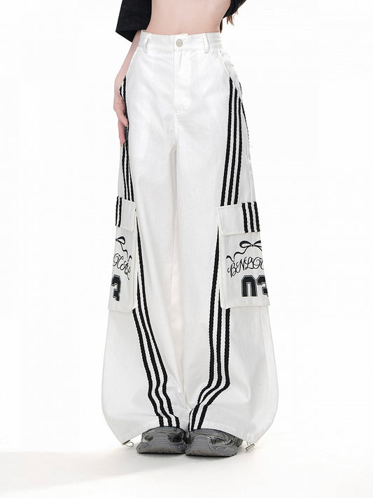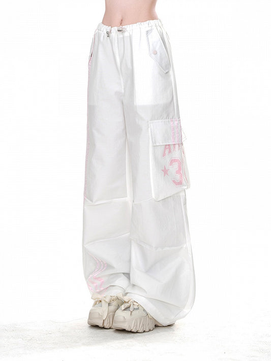 White Drawstring Waist Cargo Loose Straight-Leg Pants Pockets