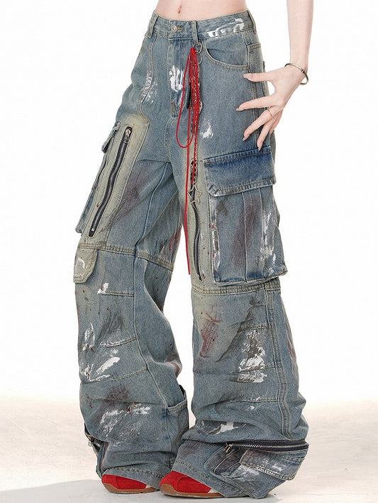 Blue with Wide-leg Cut Design Zipper Cargo Jeans Spray Paint Print