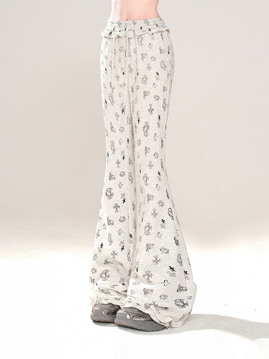 Gray Glamorous Kitty and Cross Print Drawstring Flared Pants Waist