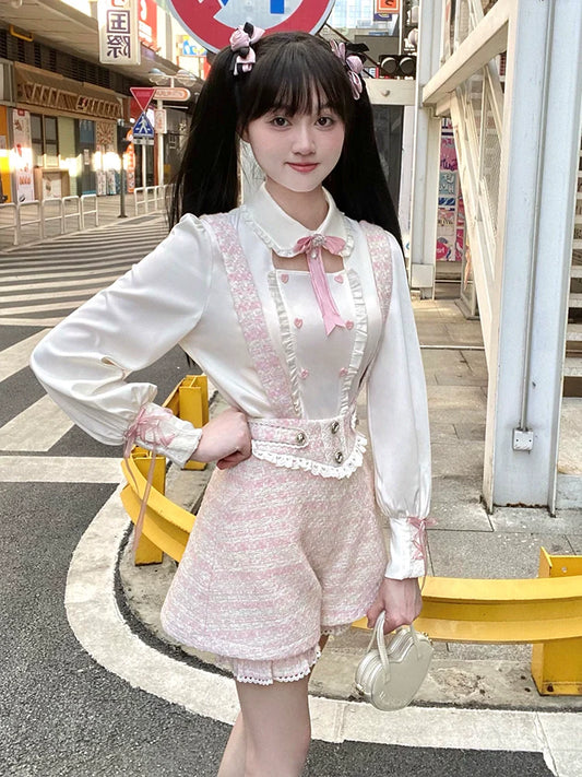 Girl Blouse Pants Pink Suspender Pure Tweed