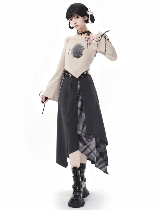 Lace-up + Sleeve + Top Skirt Pants Beige Irregular Wide