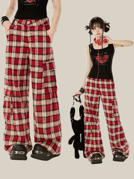 Black and Red Plaid Studs Detail Wide-Leg Pants