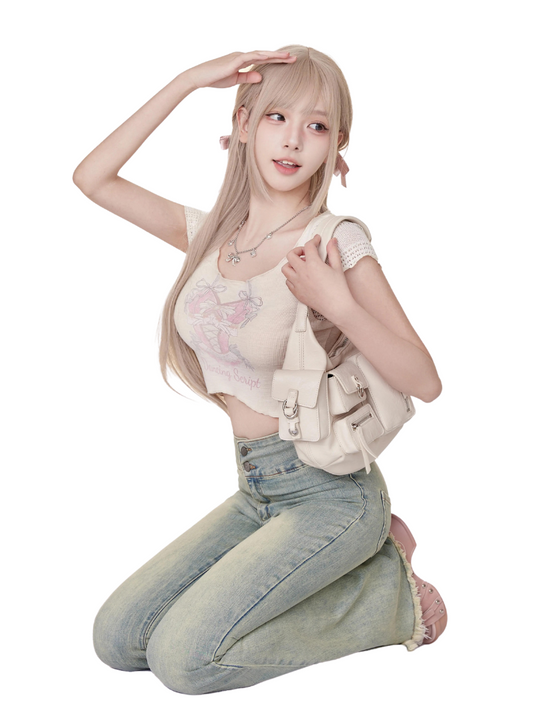 Blue High Waist Bow Decorated Straight-Leg Cut Jeans