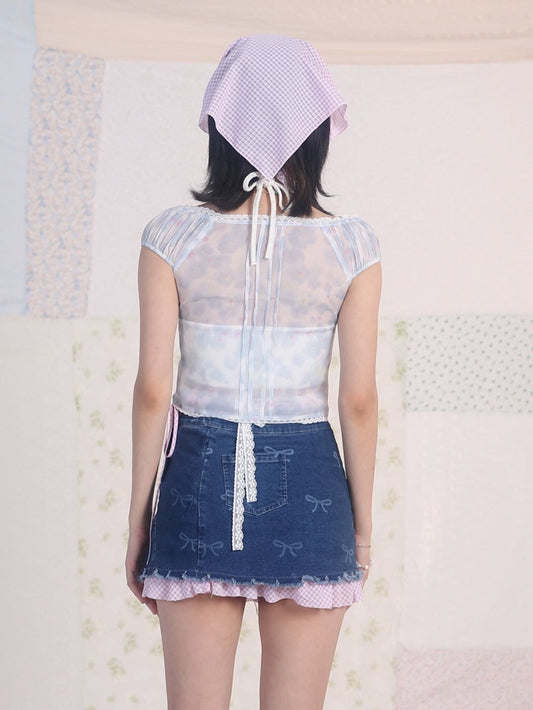 Blue Floral Lace Trim V-neck Top