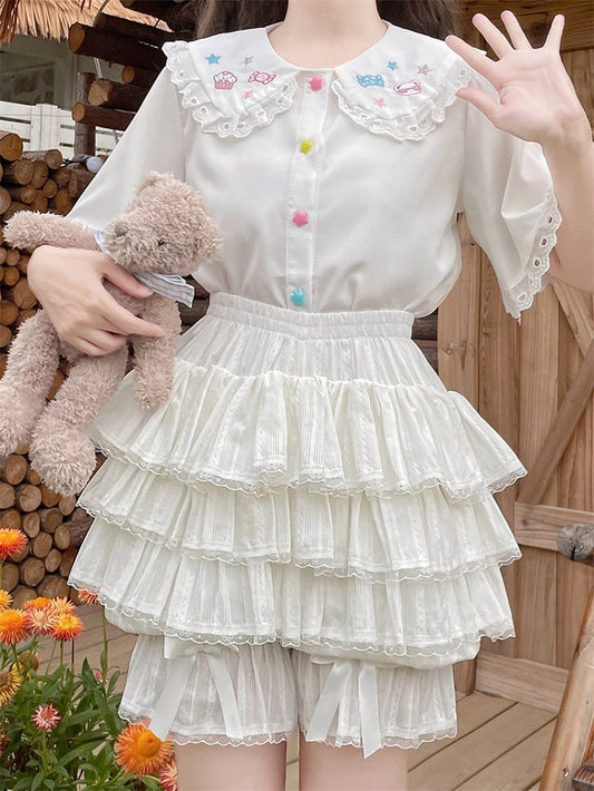 Bloomers Jirai Lace Trim with Alternative Crown-Embroidered - Detachable Fashion Garter Tiered Kei White
