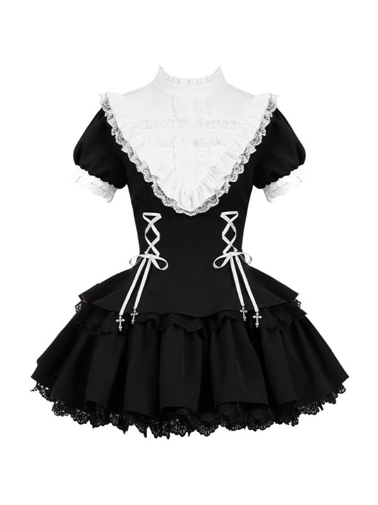 Short Ruffle Black Sleeves White Neckline Gothic Cross Lace-up Charms Dress Lolita