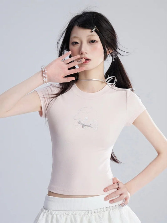 T-Shirt Puppy Print Heart Cropped Adorable Pink Charm Bittersweet