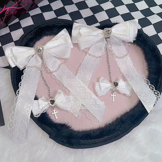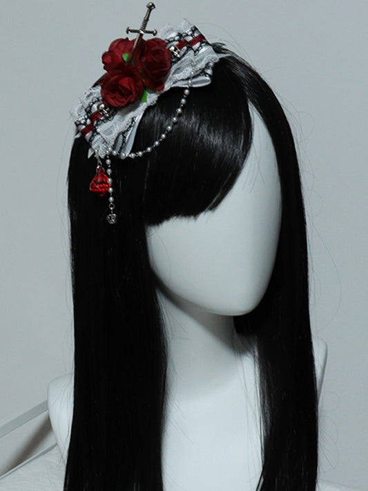 RedWhite Rosette Sword Hairclip Trim Bowknot Design Lace Decorated And Skeleton Charm Beaded