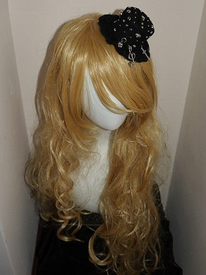 Rhinestone Embellished Jirai Kei Black Bow Cross Charm Hairclips
