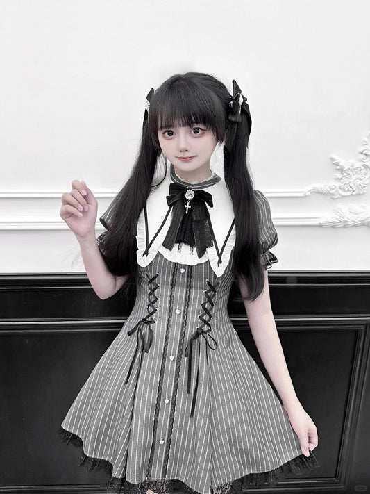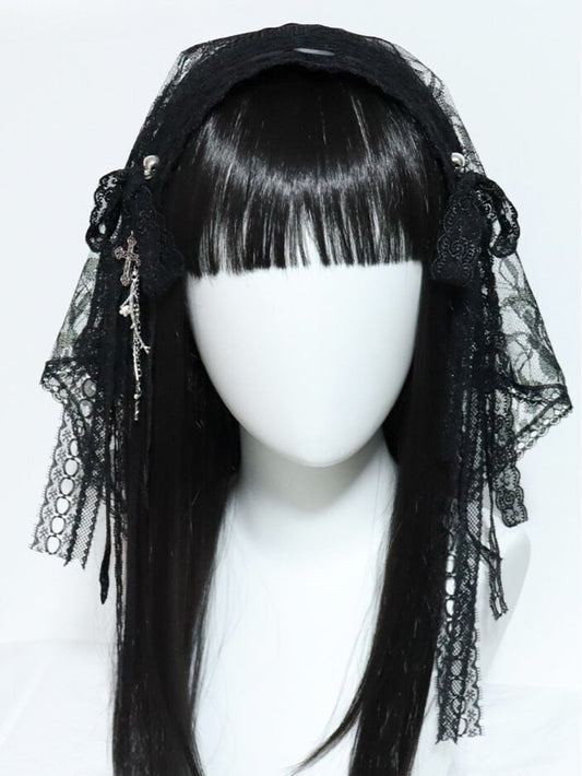 Cross Veil Hairband And Black/White Lace Floral Charm Details Bowknot