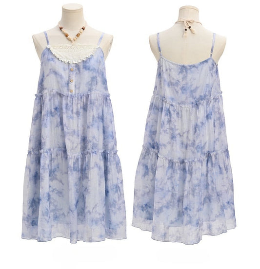 Shell Charm Neckline Dye Tassel Hem Tie Dress Loose Slip Blue Chiffon
