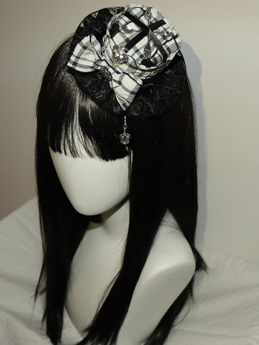 Mini Charm Scoop Pattern Crown Plaid Decorated BlackWhite Hat Bowknot And Fork
