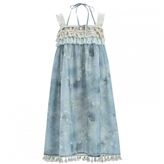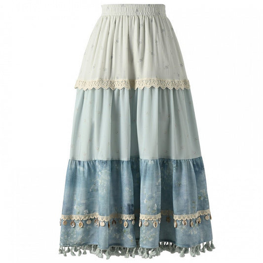 Dye Tie Blue Skirt Design Tassel Hem Shell Charm Patchwork Trim Lace