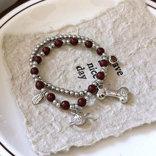 White/Black/Red Saturnand Bone Charm Beaded Bracelet