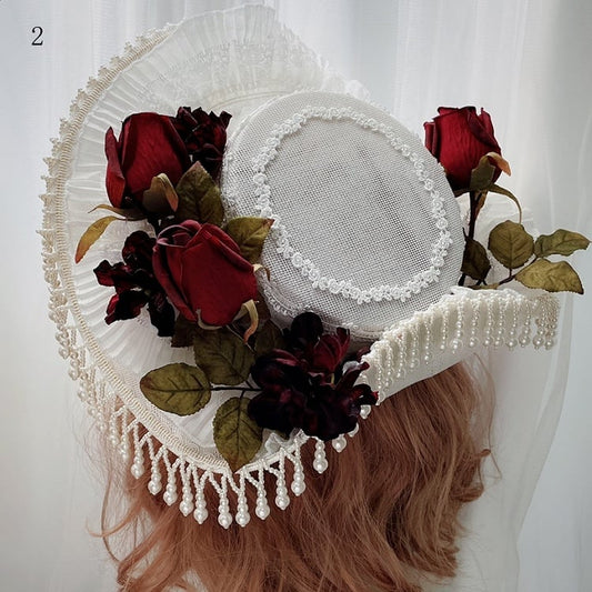 Lace White Decorated Mini Hime Trim Hat Design Floral Lolita Beaded Charm Feather