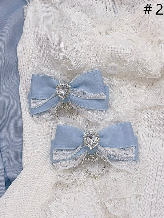 Jirai Kei Blue Rhinestones with Heart Charm Detail Bowknot Hairclips
