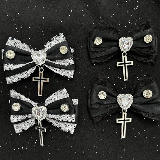 Jirai Kei Rhinestones Adorned Cross Charm Bowknot Hairclips