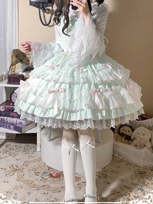 Lace-up Waist Lace Trim Sleeves Old School Lolita Cotton Green Mint Jumper Flutter Skirt Dress