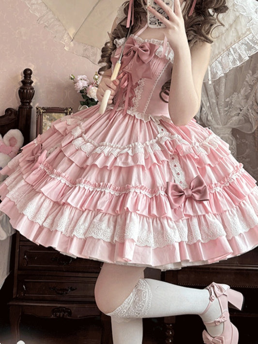 Bow Sweet Lolita Dress Flutter Pink Lace-up Bodice High Waist Sleeves with Big Jumper Skirt Detachable