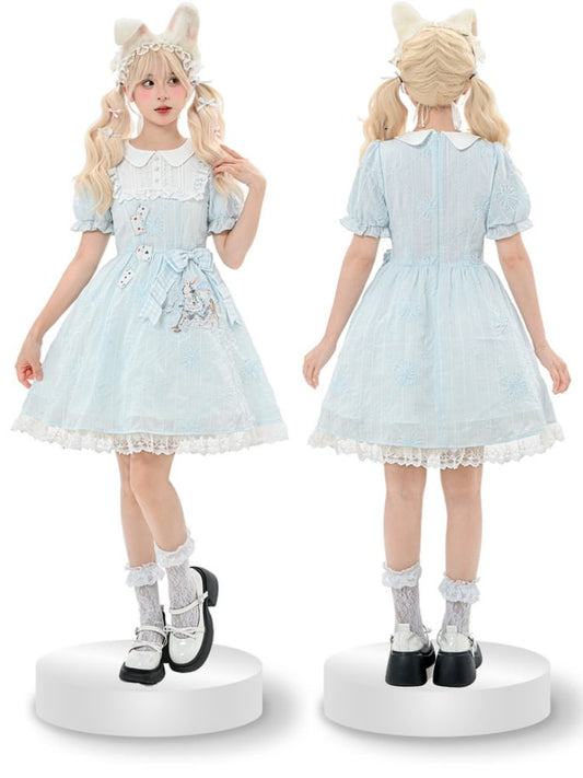 Embroidery Blue Puff Sleeves Dress in Wonderland Vibes Bunny Alice