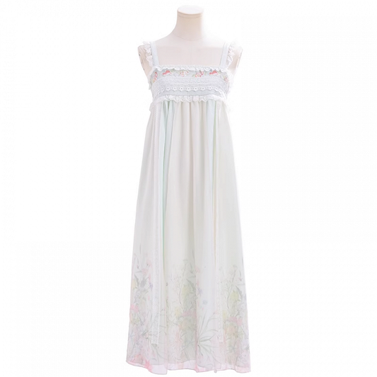 Side Self-tie Fawn Embroidery Chiffon Overdress Neckline with White Semi-Sheer Ruffle Straps