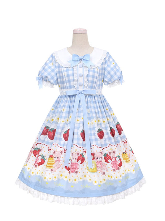 Light Blue/Wine Red Plaid Strawberry and Bear Print Cottagecore Country Dress Sweet Lolita OP