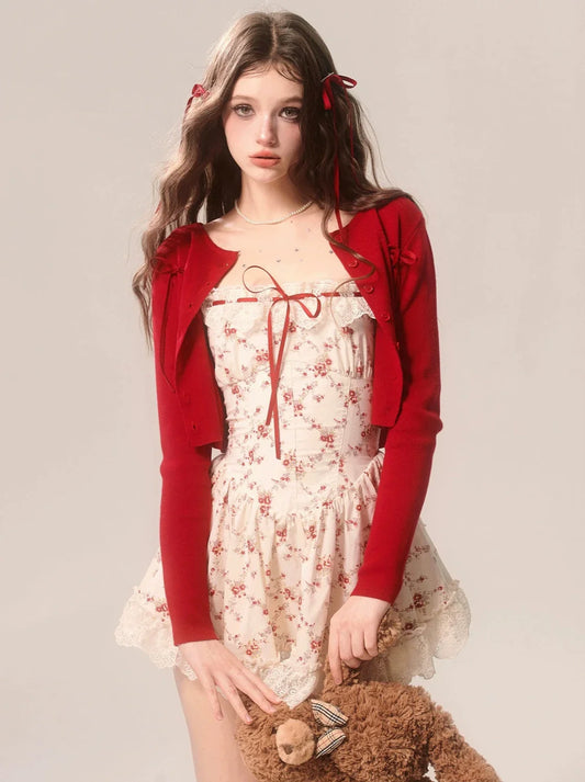 French Floral Dress Cardigan Suspender Short