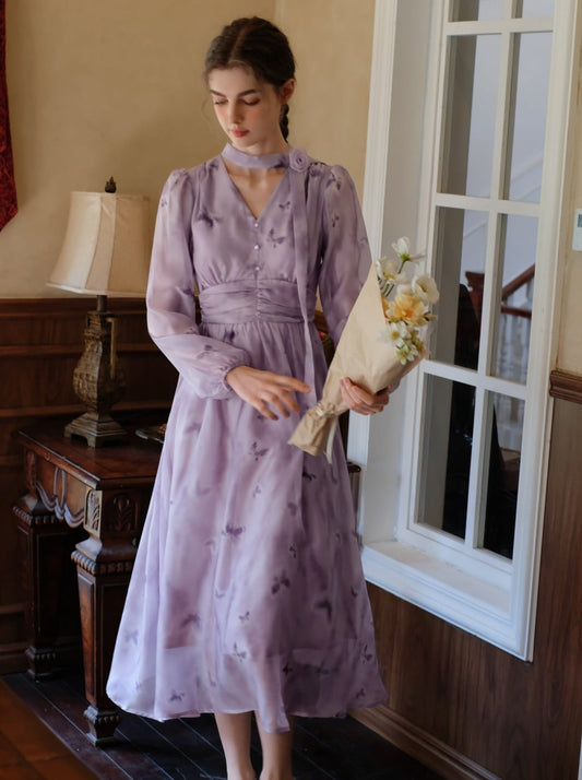 Print Dress Chiffon Bloom French Butterfly
