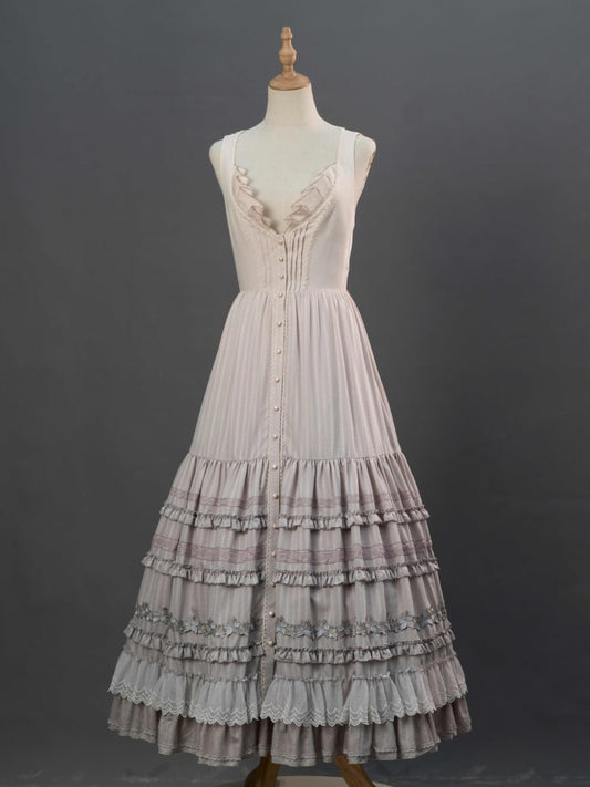 Lily Embroidery Applique Layered Hem Gray Classic Lolita Dress Front Button Placket