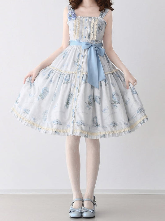Hydrangea Print Blue Summer Floral Dress Front Button Placket Hem Lolita Jumper Skirt