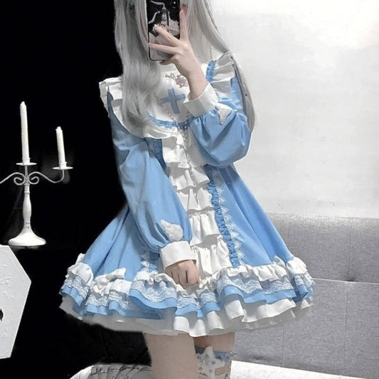 Jirai Kei Light Blue Lace Patch Shoulders Landmine Style Lace Trimmed Long Sleeve Dress