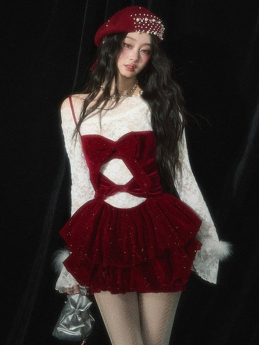 Christmas Red Cutout Detail Tiered Bubble Skirt Dress with Free Undies