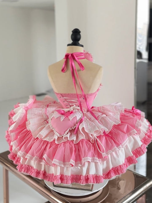 Pink Boned Basque Waist Puffy Dress with Bowknots and Big Padded Heart
