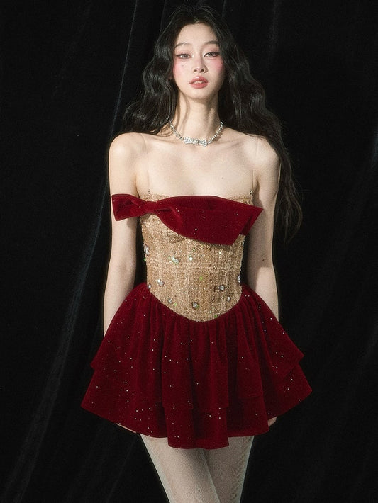 Christmas Wine Red Rhinestones Adorned Tweed Patchwork Bodice Tiered Skirt Strapless Dress