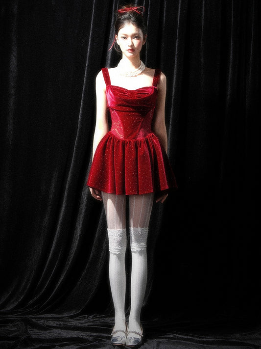 Red Basque Waist Plush Trim Hemline Christmas Lolita Dress Adjustable Thin Shoulder Straps