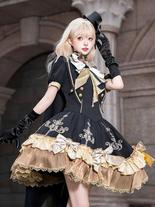 Dress Bow Lolita Lace Gold Black Trim with Details Stand Collar and