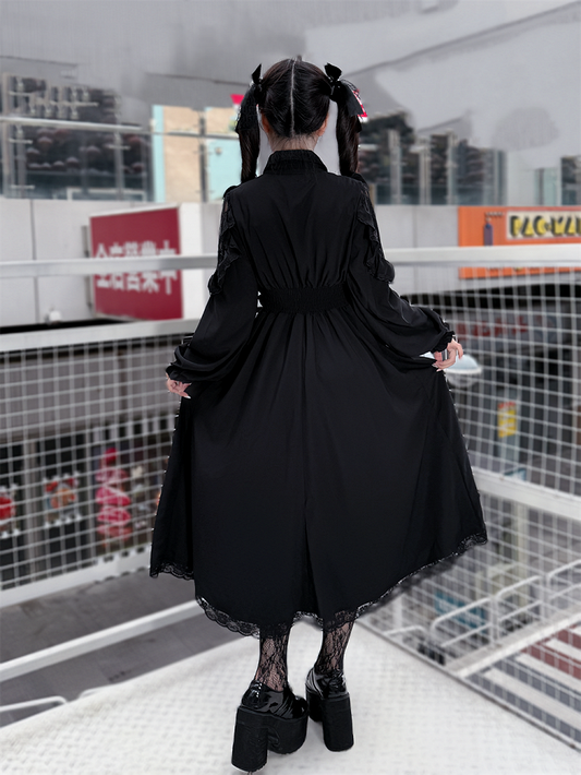 Lolita Gray Sleeves with Bell Black Dress Ruffled Gothic