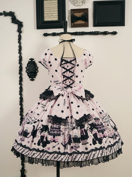 Lolita Black Dress Dot with Sweet Cat Polka Pink Accents Print Bow