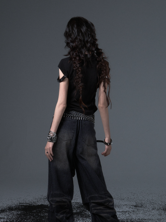 Washed Zippered Flare Black-Grey Studs Jeans Pockets Punk With