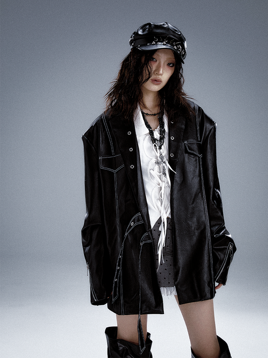 Details Black Suit Design PU Punk With Zip Metal Cuffs