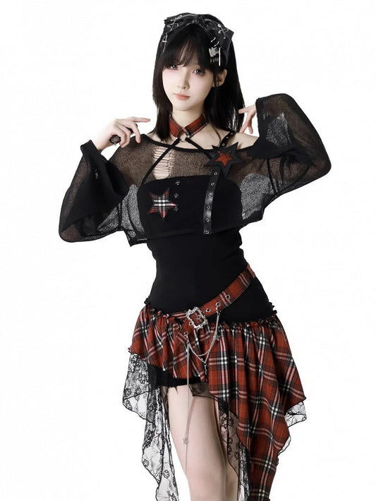 Mesh Bell Grunge and Fairycore Black Rock Punk Blue Sleeves Top