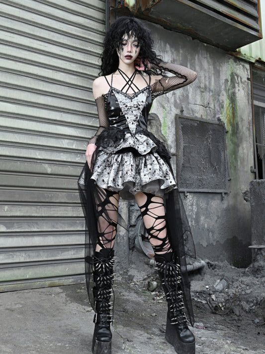 PU Suspender Punk Halter-neck Mesh Metallic Off-the-shoulder Tulle + Top Dress Sheer
