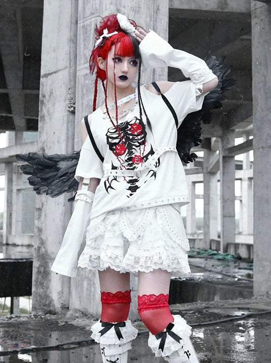 Off-the-shoulder Slit Punk T-shirt Loose