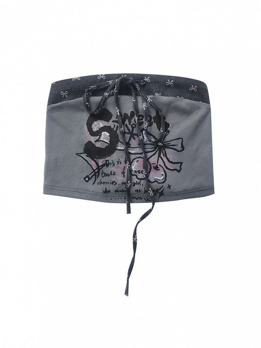 Bow Crop Punk Strapless Ties with Cherry Gray Top Patchwork Print