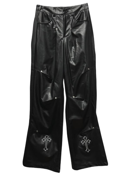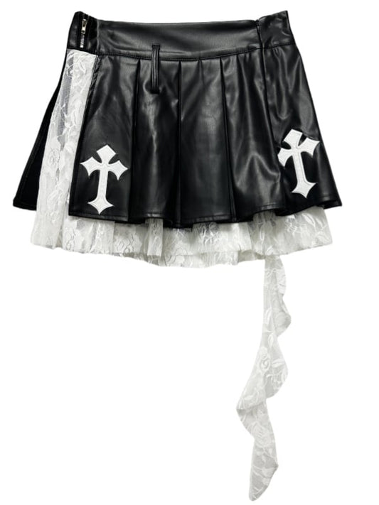 Punk Rock Black Cross Appliques PU Patchwork Box Pleat Skirt
