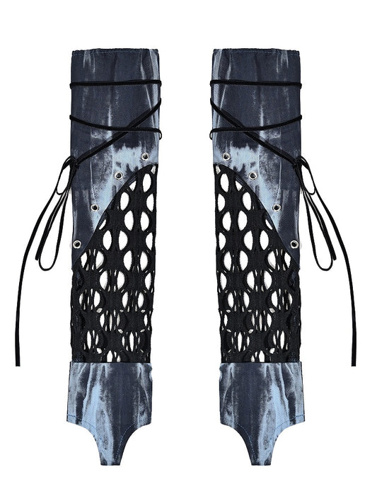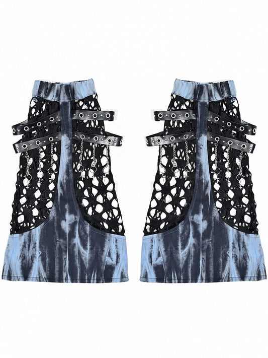 Grunge Punk Rock Mesh Patchwork Blue and Black Tie Dye Leg Warmers Straps with Chains