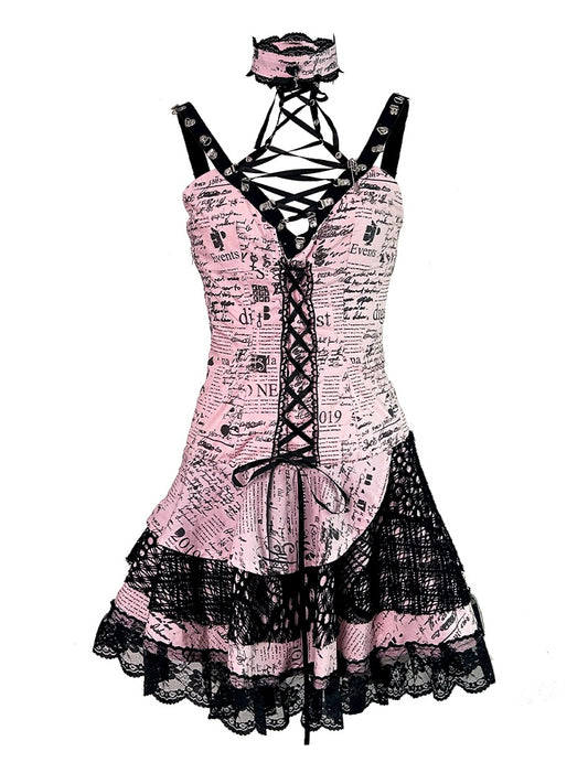 Pink Print Sleeveless Lace Trim Punk Rock Dress