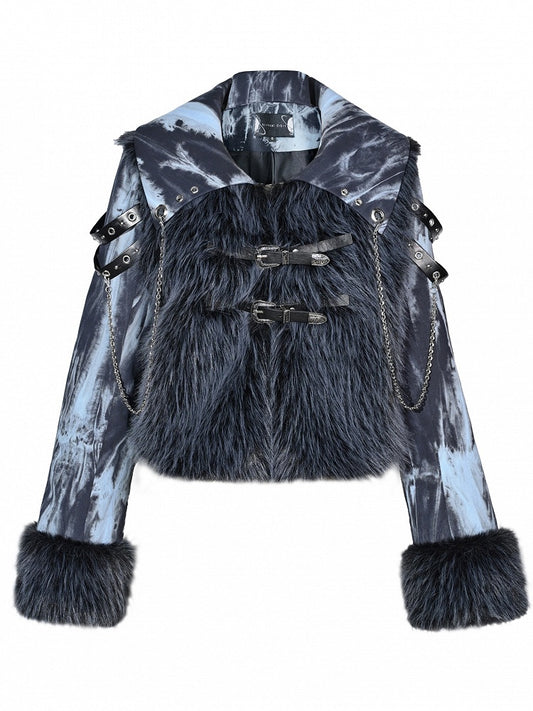 Grunge Punk Rock Blue Faux Fur Patchwork Jacket Chain Detail