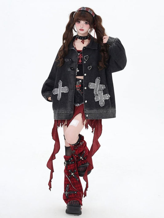 Punk Rock Studs Crosses Black Loose Denim Jacket