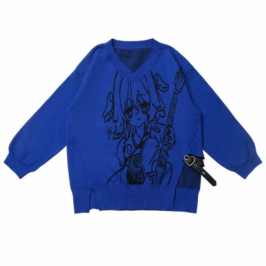 Punk Rock Girl Pattern Blue V-neck Sweater with Heart PU Buckle